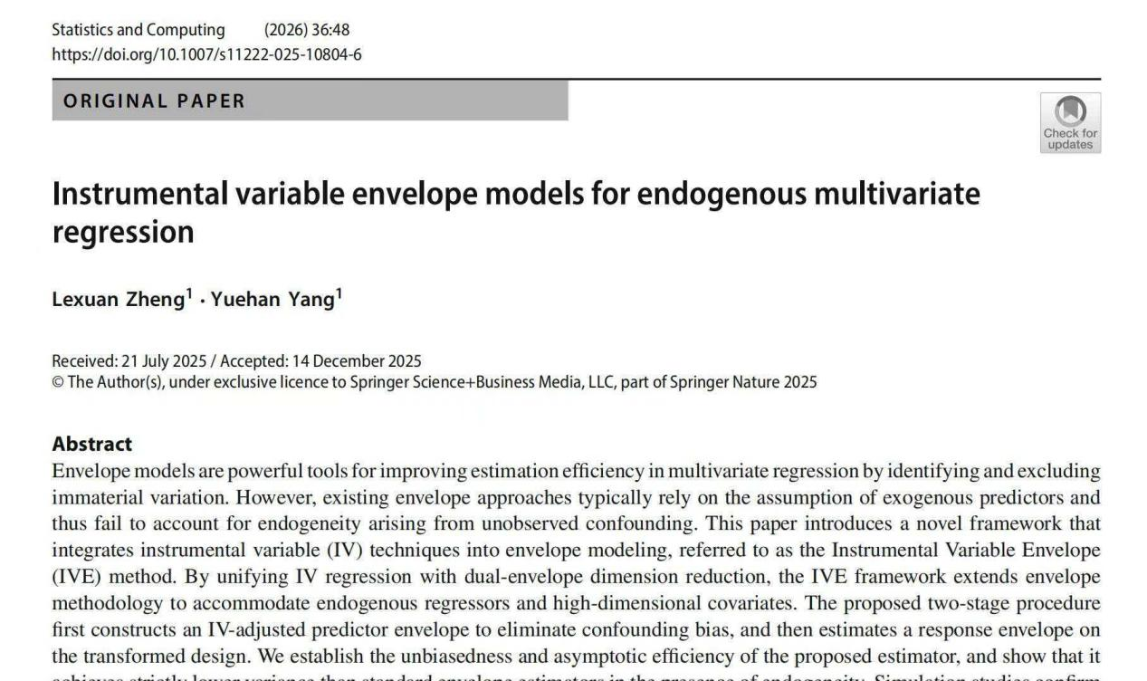 成果速递第12期:包络模型研究2025-12-31公司统金23级本科生郑乐轩在杨玥含教授指导下,在公司2A期刊同时也是统计学1区期刊Statistics and Computing发表了一篇关于包络模型的论文。本文提出提出工具变量包络模型IVE,将IV回归与包络降维统一起来,面向多元回归中常见的内生性…