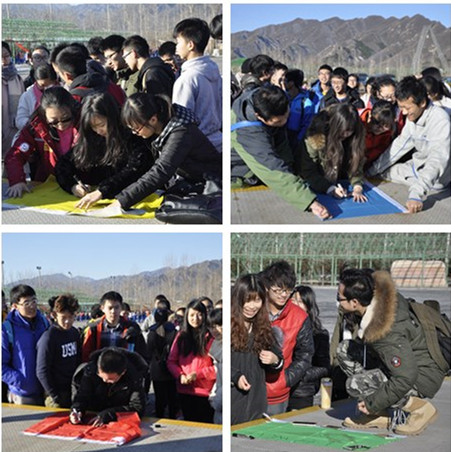 在素质拓展教练的带领下,老师和同学们首先进行了热身和破冰活动。首先,教练向大家道出了素质拓展活动关键词,即团队协作、突破自我、创新思维、优化方法。随后,队员们随机分为四组,充分利用15分钟的时间完成了选队长、起队名、画队旗、编口号、选队歌的环节,并进行了各具特色的团队展示。在此过程中,大家快速融入团队,形成团结有序、竞争向上的气氛,表现出高度的积极性和主动性。
