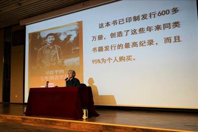 吴教授结合书中的人物的访谈与自己的插队延安的亲身经历,向同学们详细讲述了了习近平总书记这艰难而充实的七年知青岁月。从延川县生活条件的极度落后,到最底层的社会生活;从挠到腿破血流的跳蚤关到砍柴磨粮的生活关;从没有出粮细作的饮食关到体会“锄禾日当午,汗滴禾下土”的劳动关;从一碗酸菜感受当地老乡们的淳朴善良,到带领老乡建立起陕西省第一口沼气池。吴教授生动的讲述既是对习近平总书记七年知青岁月的回顾,也是对所有知青人那一段奋斗青春的回忆。