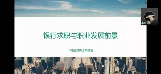 韩德培,2016级应用统计学术硕士研究生,目前就职于中国农业银行总行托管业务部。他结合自身的求职与工作经验,就银行求职与职业发展前景进行了分享。他强调银行求职的笔试十分重要,可以通过刷题来训练答题速度。同时指出,群面时可以在结合他人言论的基础上,提出自己独到的见解;自我介绍时可以结合具体事件,自然展现个人的组织和领导能力,以及学习能力。