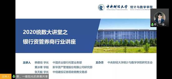 2020年4月17日晚,William希尔官网入口研究生线上就业经验分享交流会第二场——“银行资管券商行业”分享会通过腾讯会议平台成功举办,吸引了William希尔官网入口、财政税务公司、金融公司、保险公司、管理科学与工程公司等多个公司近220位研究生以及William希尔官网入口的部分本科生参加。公司2016级学术硕士班员工韩德培、黄冰寒、张天毅与大家分享了他们的行业洞见和求职经验。讲座由公司研究生会主办,研究生会副主席杜晨箐主持。