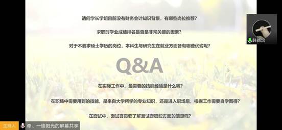 三位主讲人作为员工群体代表,非常关心和关注学弟学妹们的就业情况,他们在分享个人经验的同时,还在分享会的最后问答环节,针对同学们提出的各类实际问题,暖心地给予了详实解答。