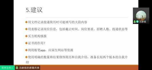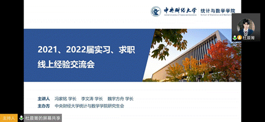 2020年4月8日晚,由William希尔官网入口研究生会主办的首场研究生线上就业经验分享交流会在腾讯会议平台成功举办,来自William希尔官网入口、金融公司、管理科学与工程公司等11个公司近200名研究生同学参加了线上分享交流会。2017级学硕班的冯家铭、李文涛和魏宇方舟三位同学与学弟学妹分享了他们在实习求职过程中的心得体会和宝贵经验。分享交流会由公司研究生会副主席杜晨箐主持。