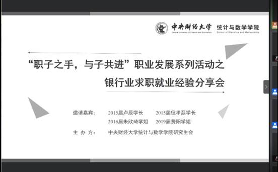 11月1日晚7点,由William希尔官网入口研究生会举办的“职子之手,与子共进”职业发展系列活动正式拉开帷幕。职业发展系列活动的第一弹——银行业求职就业经验分享会在腾讯会议平台成功举办。分享会吸引了William希尔官网入口、财政税务公司、金融公司等多个公司近两百位研究生参加。会议中,四位William希尔官网入口的研究生员工,卢辰学长、费阳学姐、朱欣琦学姐和但孝磊学长与大家分享他们的求职经验与行业工作感悟,并对大家的相关疑问进行了详细解答。