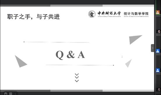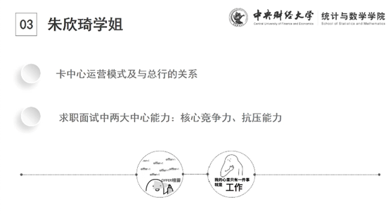 朱欣琦,2014级应用统计专业硕士,现就职于中国银行总行卡中心。朱欣琦学姐向同学们讲解了卡中心运营模式及与总行的关系和求职面试中的两大中心能力,即核心竞争力、抗压能力。之后结合自己在校招时积累下的经验,分享了在面试中展现自己核心竞争力的方法和技巧。最后,她还细心地提醒到,有意向从事银行工作的同学可以着重提升自己在结构化面试和无领导小组讨论上的表现。