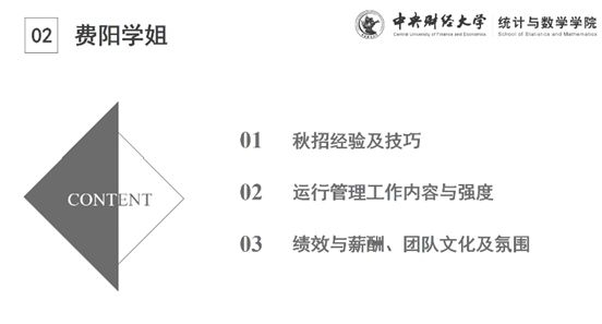 费阳,2017级应用统计专业硕士,现就职于中国工商银行总行运行管理部。费阳学姐分别从秋招经验及技巧,运作管理工作内容与强度,绩效与薪酬、团队文化及氛围三个方面与学弟学妹们展开交流。她建议在校生们提前做好求职准备,尽早形成个人简历,并且根据自身经历不断进行补充和修改。此外,学姐还与大家分享了获取招聘信息的渠道,例如各个高校就业指导中心的公众号、信息分享群、求职网站等。