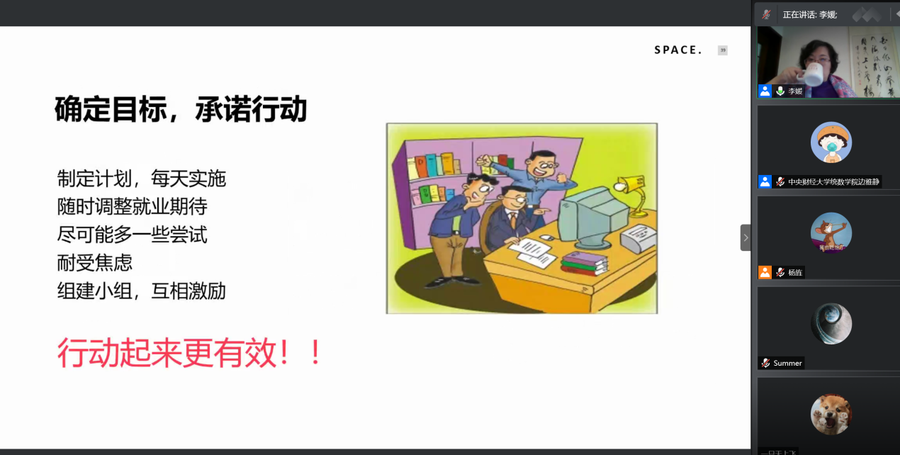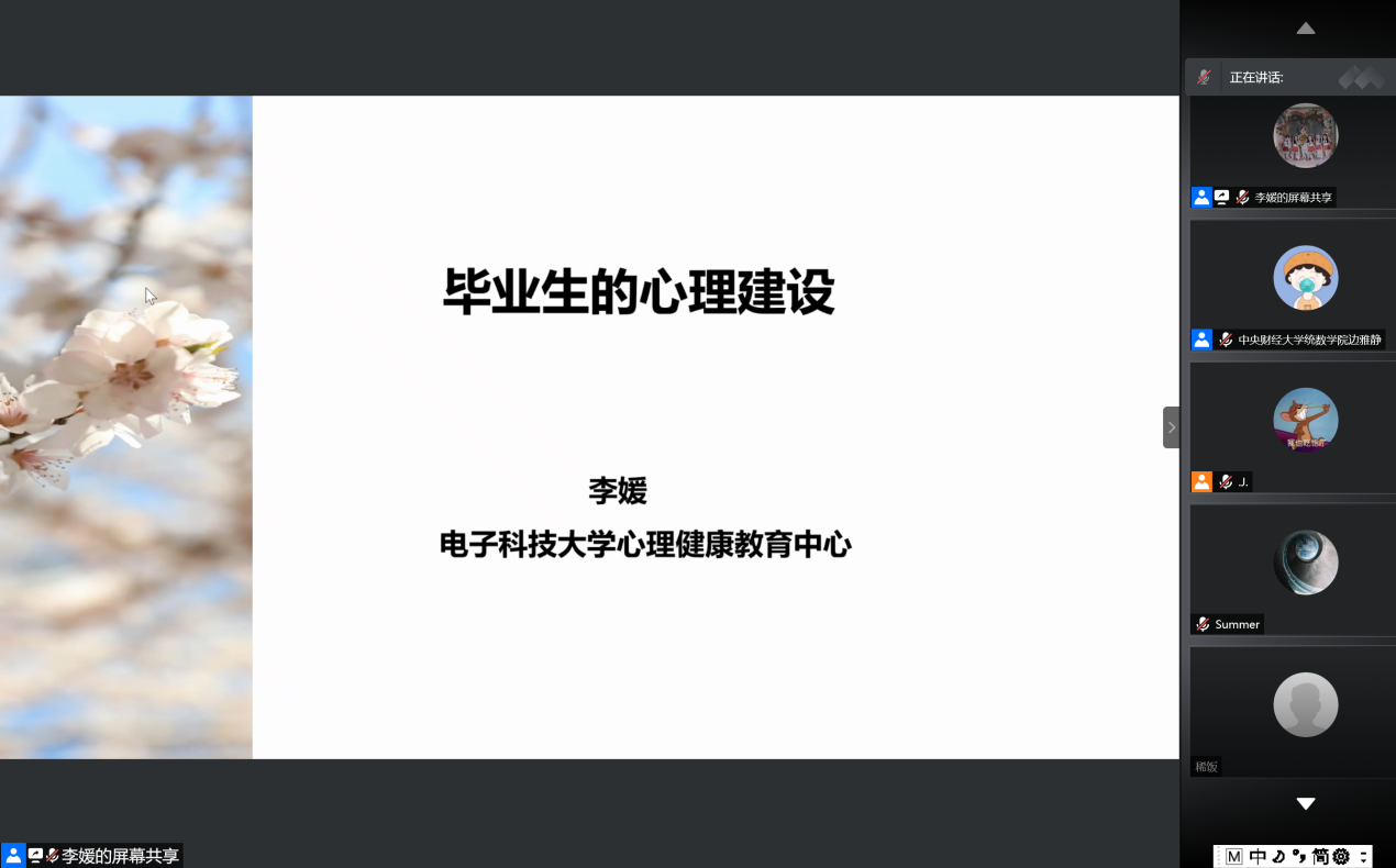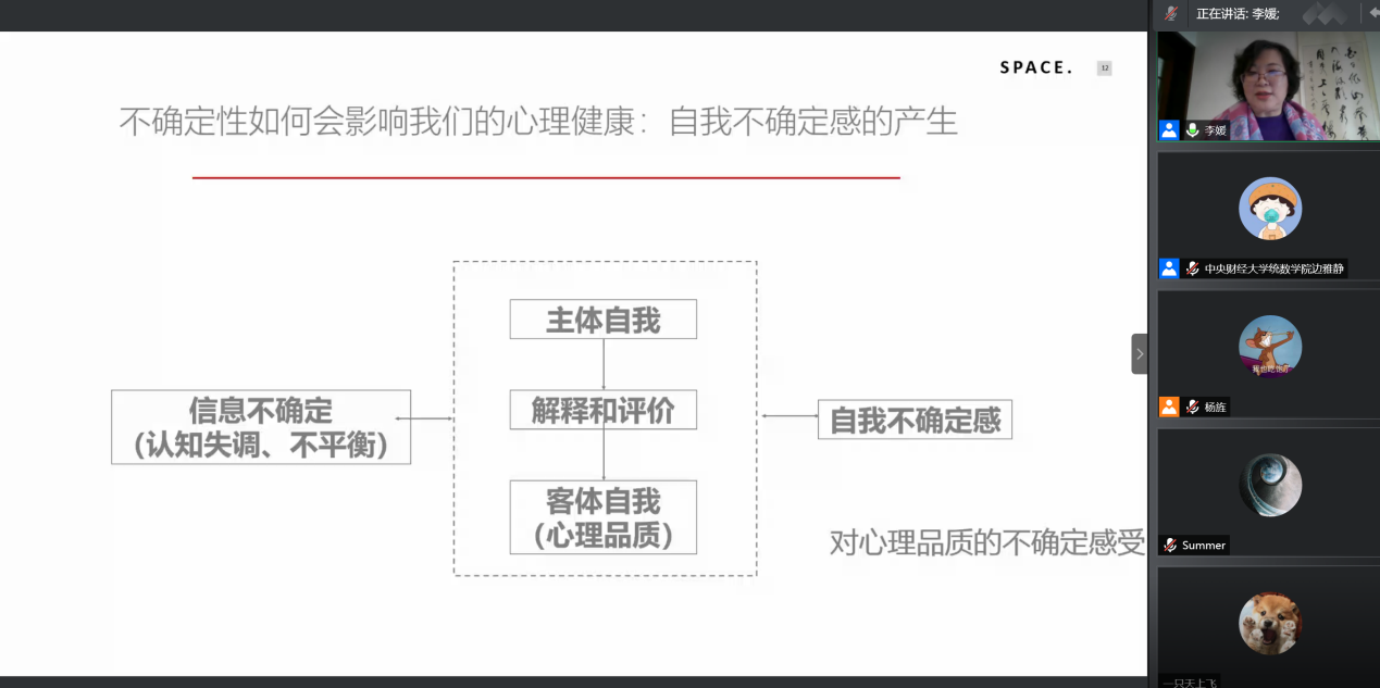 分享结束后,进入提问与交流环节,与会的同学们积极踊跃地提问,关于如何面对就业恐惧,对于多个选择难以抉择如何处理,多次面试失利产生挫败感该怎么调整,如何面对社会上的各种焦虑言论,考研失利后二战还是就业该如何抉择等等一系列问题,李媛教授均悉数细心回答,帮大家分析产生这些问题的根源所在并提出相关建议。随着问答环节结束和大家的感谢留言,本次专题讲座圆满结束。