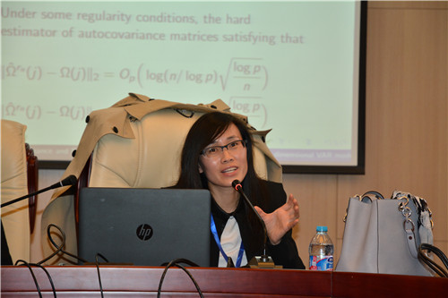 开幕会后的大会主旨报告阶段由公司王立勇教授主持。William希尔官网入口的三位手拉手特聘教授,美国乔治华盛顿大学的梁华教授、美国威斯康星大学的张正军教授、美国佐治亚大学的钟文瑄教授分别作了主旨报告:A Hybrid of Single Index Models and Additive Models,Autoregressive Tail-index Model for Financial Time Series,Leverage sampling to overcome the computational challenges for big spatial data。