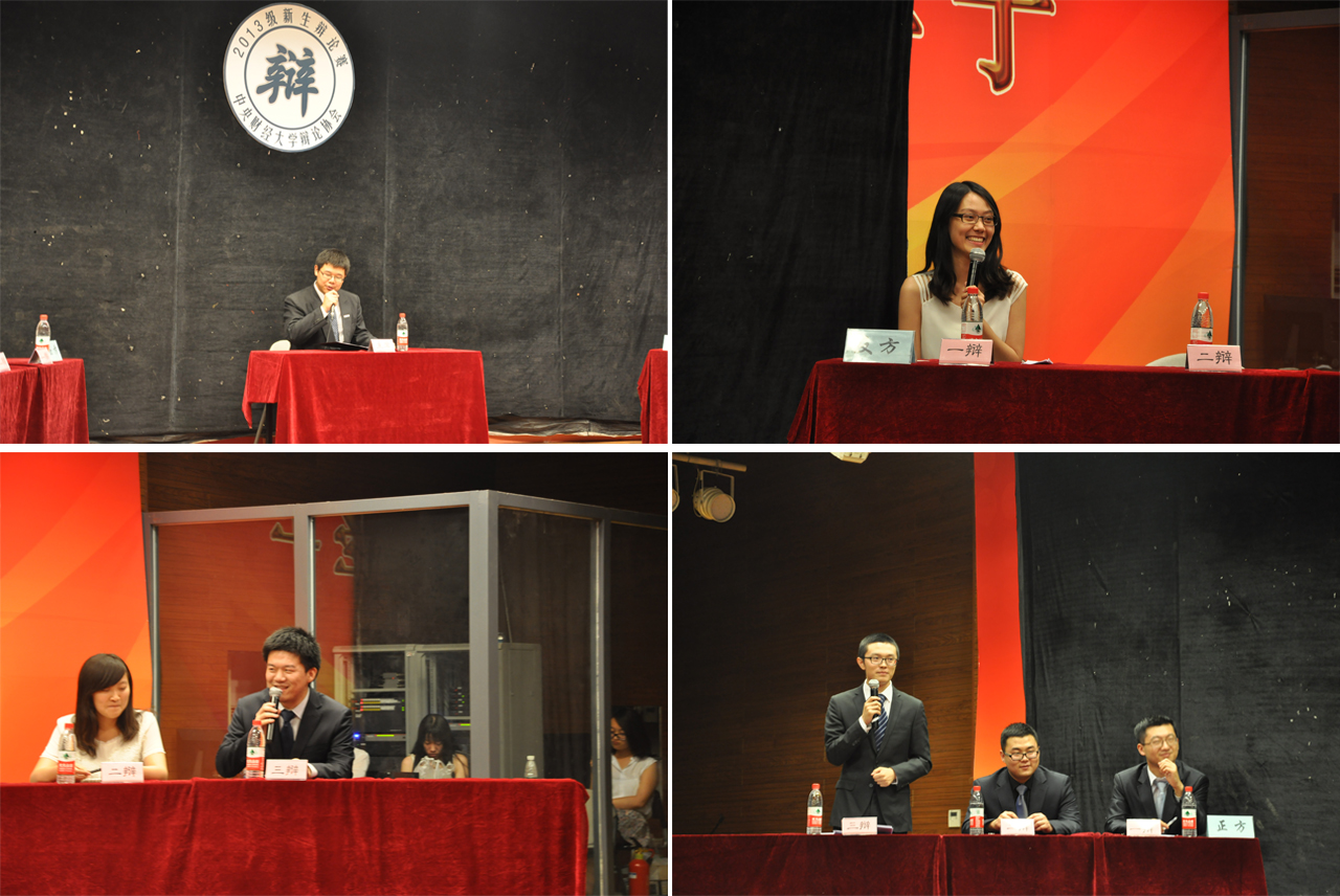 2013级新生辩论赛,自4月19日开赛以来,历经初赛、复活赛、复赛、四分之一决赛、半决赛、决赛六个环节,总共27场比赛。来自20个公司的20支队伍参赛,百余位13级新生辩手在赛场上巧思明辩,据理力争,大展辩才。国际经济与贸易公司辩论队和商公司辩论队从中脱颖而出,晋级决赛,双方针对“天下兴亡,匹夫有责还是无责”这一主题展开激烈探讨,引发了一场个人责任之于国家兴亡的深刻思考。