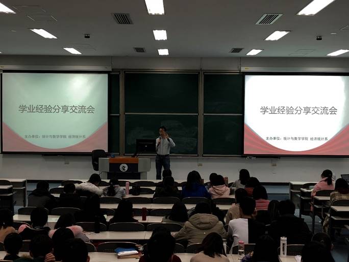接下来,交流活动正式开始。由张之昊同学首先向大家进行经验分享。关于毕业后我们统数人能做什么,是所有人都很关心的问题。张之昊通过过去两年内公司毕业生去向数据的展示与个人这两个月来的秋季招聘的体会,向大家深入浅出的解答了这个人人关心却鲜有回答的问题。