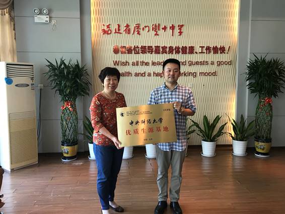随后,招生宣传组赶赴福州,在5月15日 上午对福州一中进行了走访,与福州一中蔡辉森副董事长等进行了交流。双方就人才培养理念创新与思路创新达成共识,希望能有更多合作机会,共同培养优秀人才,双方签署了生源基地建设协议,并举行授牌仪式。