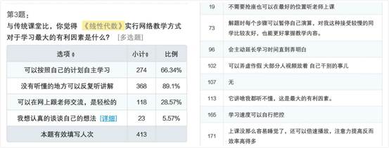 调研一、目前的《线性代数》网上教学形式比着传统教学你感觉如何?(“学”之调研,数据实时更新,有效回答413人)