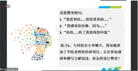 随后,南荣素老师又与同学们分享了焦点解决的花式赞美技术。在与人沟通的过程中可以采用直接赞美、自我赞美和间接赞美的方式来帮助他人疏解压力。同时在赞美的过程中要注意不夸大不想象、不带期待和要求、符合对方价值取向。老师用赞美卡与同学们进行实战练习,同学与南老师积极互动。