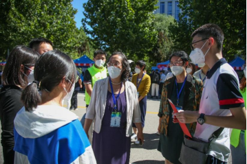 与志愿者和新生进行亲切交谈