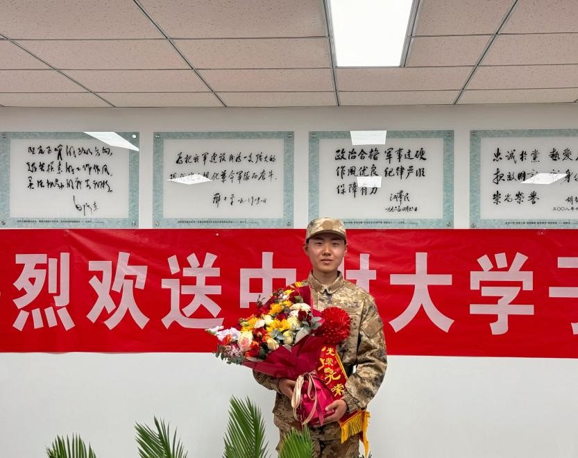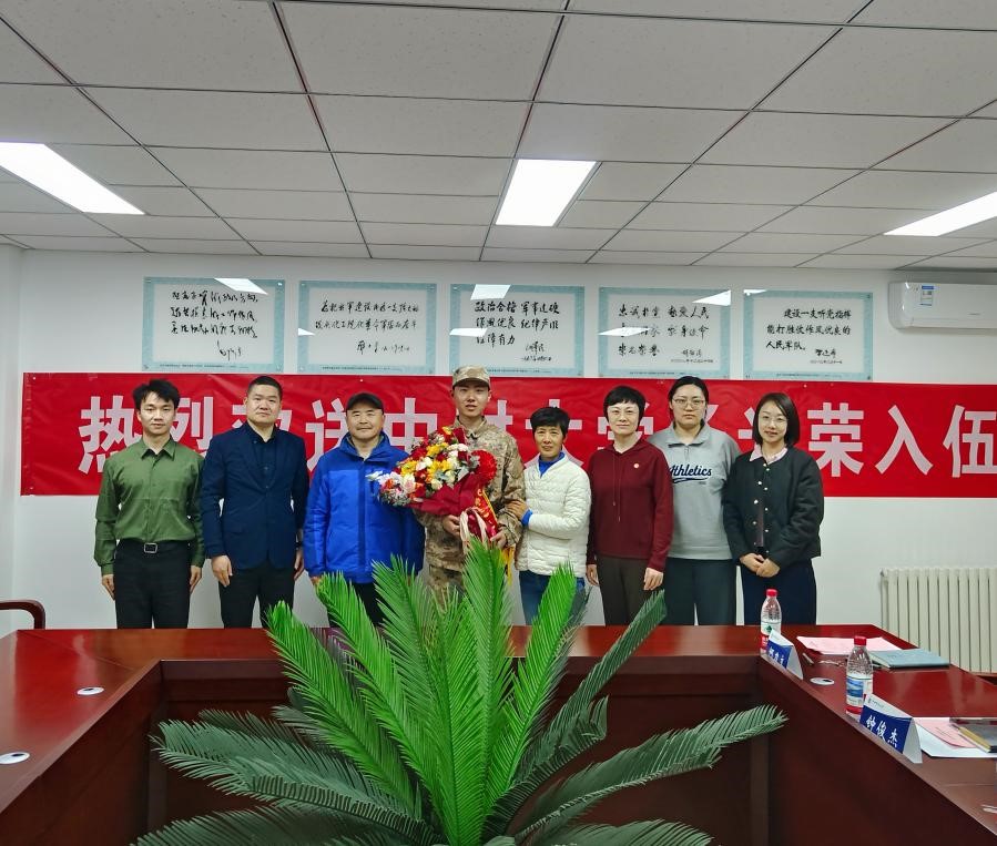 武装部副部长钟俊杰代表公司对今年光荣入伍的张盛尧同学表示祝贺,对其积极响应党和国家号召并顺利通过体检、政审和役前训练等环节严格选拔表示肯定,宣读入伍通知书后寄语入伍新兵把握成长机遇,积极适应部队生活,尽快完成从员工到展示的身份转变,积极迎接军人新挑战;遵守部队纪律与要求,服从命令,听从指挥,认真完成党和人民赋予的各项任务,成为一名带有中财大标记的好兵、尖兵。