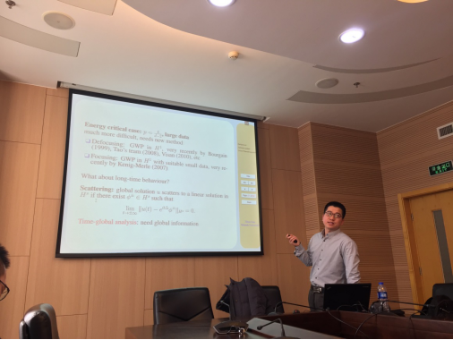 在讲座中他提到,对于用调和分析技术研究色散偏微分方程的适定性和长时间行为这一领域聚集了很多国际顶级数学家,如94年的Fields奖得主Bougain,2006年Fields奖得主Tao等数学家都在此领域做出了很多杰出的工作。随后,他以二阶Klein-Gordon方程为例,介绍了他的研究小组自2012年以来研究二阶色散方程的散射行为的主要思想和一系列的结果。证明的主要的想法是对方程建立一般的Strichartz估计结合Shatah开创的规范变换方法;对于径向情形,Strichartz估计成立的范围会更广。 非径向情形则需要施加额外的角正则性的条件。 他的研究小组证明了3维Klein-Gordon方程、 Zakharov系统、Gross-Pitaevskil方程小初值径向解,或小初值带角正则性解在能量空间均发生散射现象。讲座最后,郭教授给公司师生提出了一些该领域可以继续研究和思考的问题,如:(1)在证明散射行为时是否可以去掉角正则性的条件?(2)对于大的径向初值是否依然可以证明散射现象?(3)对于低维情形,即1维和2维情形是否发生散射?