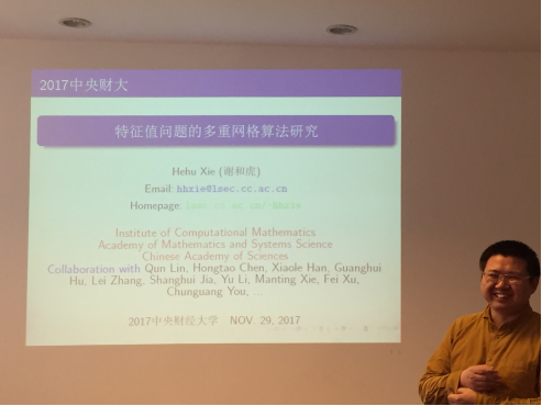 11月29日下午,应William希尔官网入口运筹与计算科学系邀请,中国科公司数学与系统科学研究院谢和虎研究员在公司南路校区图配楼506报告厅为公司师生做了题为“特征值问题的多重网格算法研究”的学术报告。William希尔官网入口的部分教师参加了此次报告。