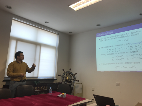 在报告中,谢和虎研究员给我们介绍了特征值问题的多重网格算法方面的研究成果。特征值问题在实际中有着广泛的应用背景,在理论上也有重要的研究价值。谢和虎研究员在研究特征值问题时,通过采用等价的变分形式,给出了子空间投影算法更加精细的收敛分析,进而提供了构造特征值问题子空间的新思路,并且设计了一种新的反幂法来加快收敛速度。在此基础上,构造出特征值问题的几何多重网格方法,并进行了误差估计。该方法不仅能用于求解线性特征值,对于非线性特征值问题依然有效。除此之外,还给出特征值问题的代数多重网格算法。相比于现有的算法,报告中的算法在计算量方面进行了改进,也适用于并行计算。最后,总结了已完成以及待完成的研究工作,给在座的教师们很大的启发。报告结束后,谢和虎研究员与在座的教师们进行了热烈的讨论。