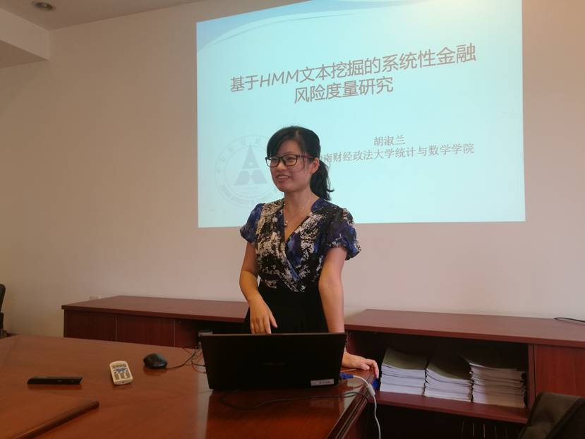 胡淑兰教授,中南财经政法大学数理与金融统计学系,硕士生导师。从事经济计量学、随机模型及其应用、随机分析等领域的研究。主持国家自然科学基金、国家社会科学基金、中央高校项目、校内教学项目、横向课题等十几项。在《Stochastic Processes and their Applications》、《StatisticaSinica》、《Bernoulli》等国内外权威期刊发表学术论文十几篇;出版专著一部。在报告中,胡淑兰副教授从系统性风险度量方法开始,包括综合指数法以及早期的预警系统,网络分析法和矩阵法,投资组合法,关联研究法等,然后详细介绍了所提方法中指标的选择,并利用这些指标进行综合指数评价。然后提出基于隐藏马尔科夫模型对关注度区间进行划分的文本挖掘的方法,最后对估计结果进行评价。