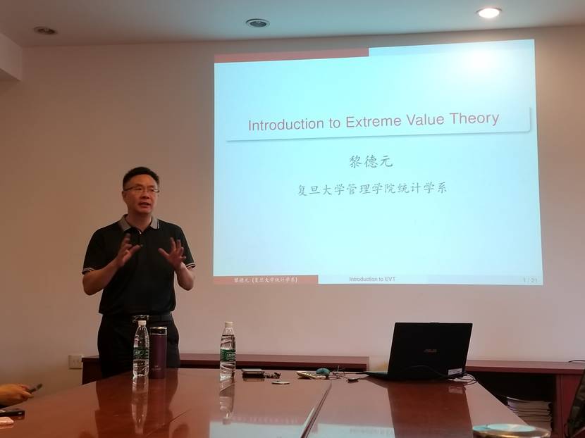黎德元教授,复旦大学管理公司统计学系,博士生导师。长期从事极值统计、风险管理等方向的研究,在Annals of Statistics、JASA等国际统计学顶级期刊,Journal of Economic Theory和EconometricTheory等国际经济学一级期刊上发表学术论文10余篇;获得国家自然科学基金三项、教育部基金一项。在报告中,黎德元教授首先从日常生活中经常谈论到的现象出发,引出什么是极值问题,并给出了极值的定义,同时引出在极值问题中需要解决的关键问题是什么,还通过武汉下雨量以及国际田径男子成绩这两个例子来说明武汉百年一遇的下雨量以及男子田径速度的极限值。接着黎德元教授详细介绍了自回归模型的极值分位数估计,包括自回归模型的设置,极值分位数的估计方法及其统计特性,利用数据模拟的方法检验了所提方法,并利用该方法研究了纳斯达克证券交易所的周收益率问题。