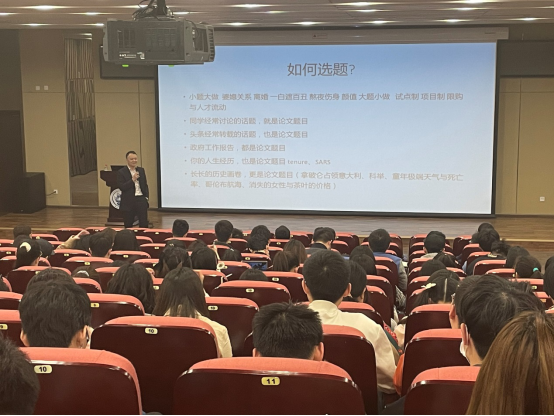接着,郑世林老师以“如何选题”为切入点,提出论文的选题主要源于生活现实、源于内心的热爱以及源于日常领导安排的各项工作。同时,新颖的题目需要学会理解社会、观察周围现象并用数据去解释现象。随后,郑世林老师从“如何做文献综述”、“如何寻找微观数据”、“如何设计模型”、“如何进行稳健性检验”、“如何解决内生性问题”、“如何进行机制研究”等方面结合生动有趣的案例,进行了深入讲解。他指出,实证文章的选题是决定文章高度的关键因素,而数据是文章出色的根本,对于整理数据、合并数据和清洗数据应至少检查三遍,才能保证准确性。对于模型处理,郑世林老师着重强调了控制变量要避免“bad control”、内生性要尽可能利用外生条件和好的工具变量予以解决。