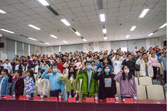 在重温入团誓词环节,现场全体团员在主持人刘宇煊同学的带领下,高举右手,握紧拳头,用洪亮的声音宣读了庄严的誓词。