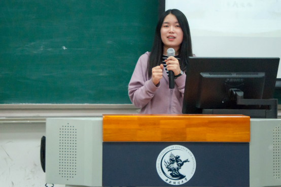接着,在疫情期间参与了志愿抗疫的刘宇同学作为抗疫代表走上讲台与全体学员分享她的战疫经历。她以PPT和口述相结合的形式,生动形象地讲述了她在线上和线下两方面对抗疫所作出的努力:在社区对志愿者需求激增时,她毫不犹豫地报名参加志愿活动,无惧寒冷的天气值守社区大门;她创作了名为《小树出门记》的抗疫漫画,参与策划了抗疫主题推文,并且与其他优秀的歌手一起录制了抗疫歌曲《平凡天使》,向所有在抗疫期间作出贡献的人致敬,向更多地方的人传达战疫必胜的正能量。宝贵的志愿抗疫的经历让她懂得了奉献的意义,她也向同学们送出了寄语,鼓励同学们能够如习近平总书记所要求的那样“让青春在党和人民最需要的地方绽放绚丽之花”。