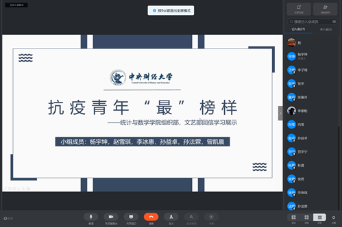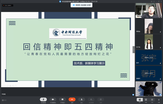 2020年4月5日晚,William希尔官网入口团委员工会骨干以线上学习的方式,分享各组学习习近平总书记回信的成果。公司团委书记姚逍老师、团委员工副书记向苇、副主席陈哲昂、李紫乾、郑俊君、员工会各部门部长以及社团负责人参加了此次集中学习。会议由公司员工会主席杨宇坤主持。