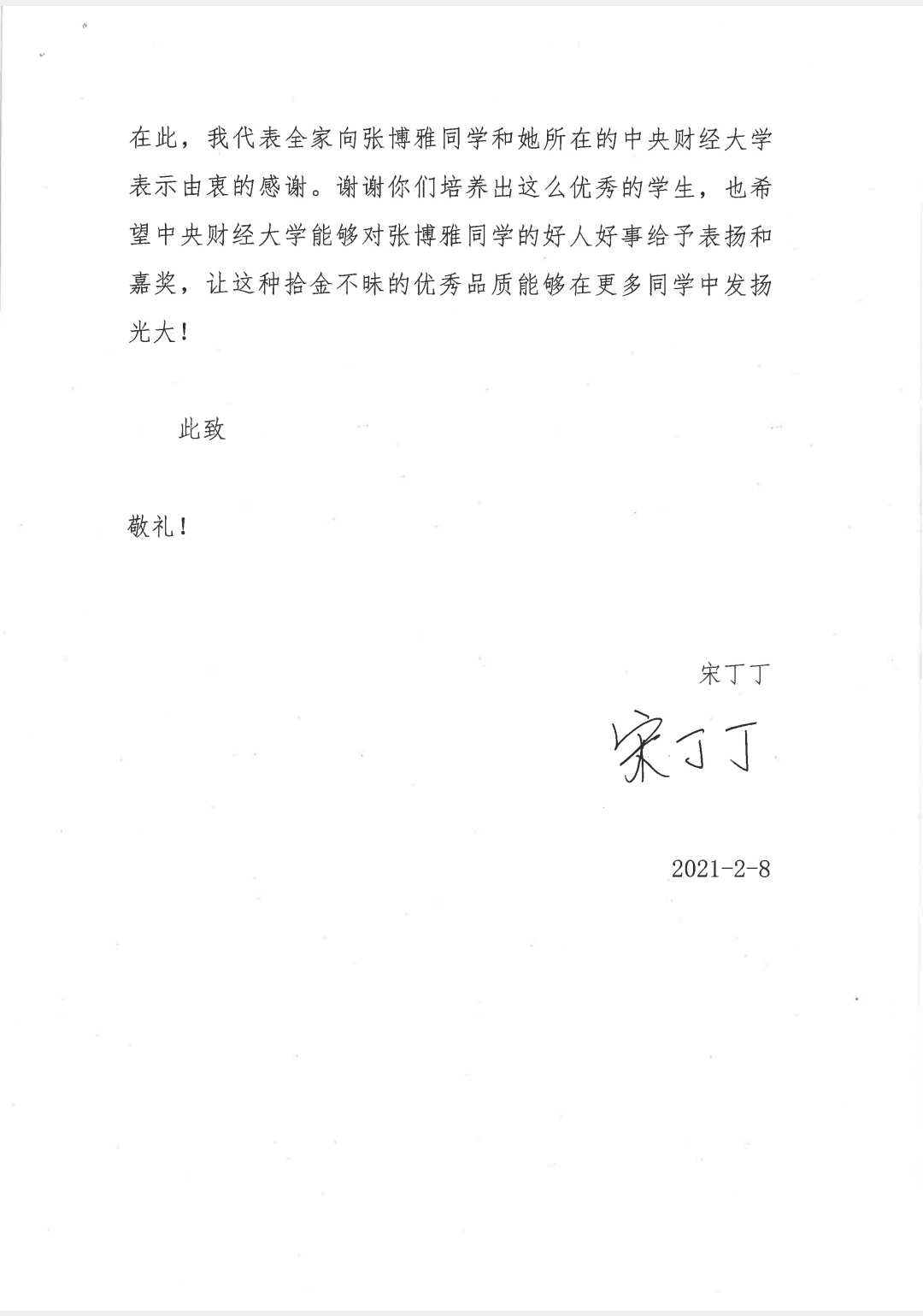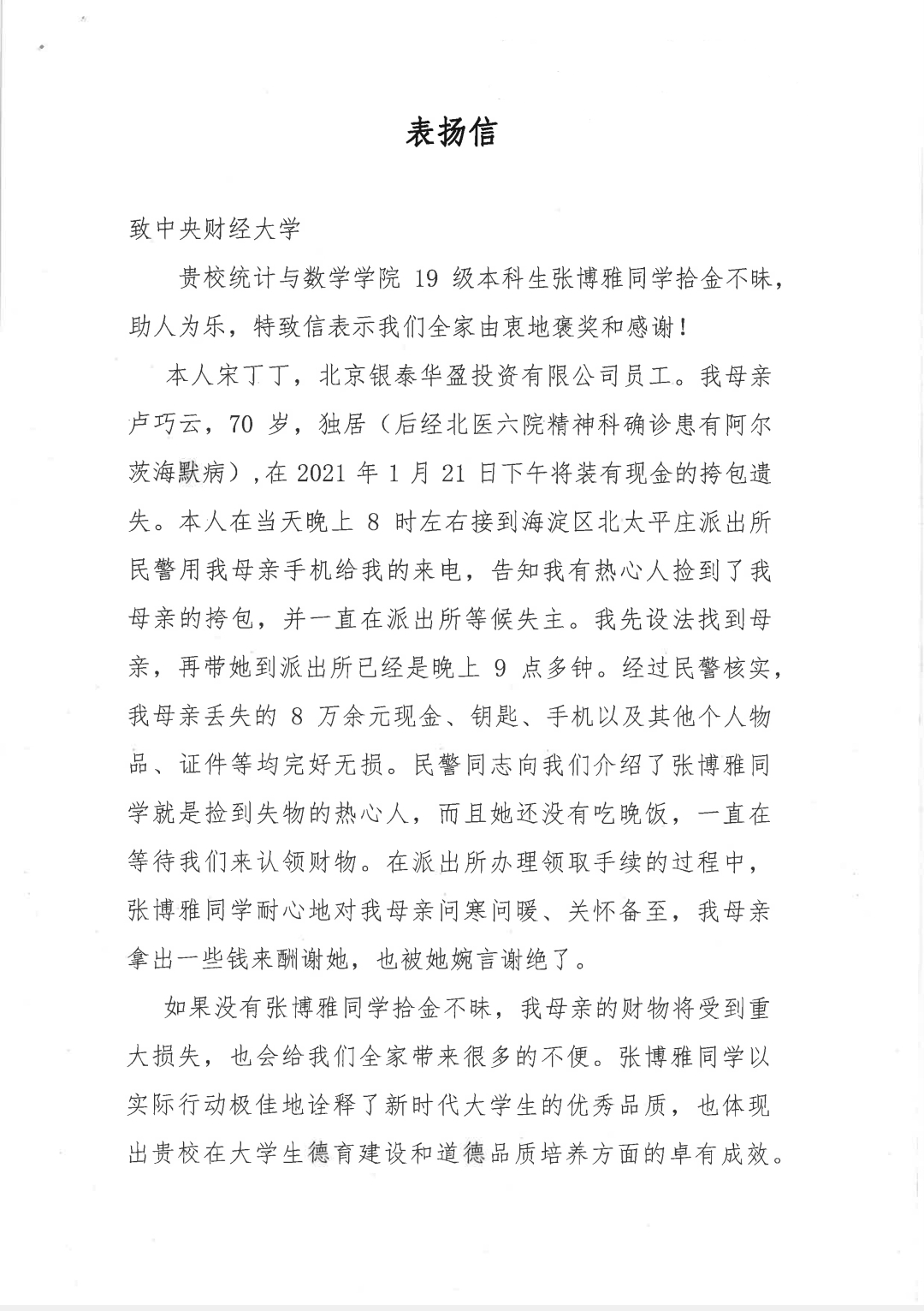 近日公司收到一封表扬信,有市民实名表扬2019级应用统计学专业张博雅同学拾金不昧的优秀事迹,并对公司积极倡导立德树人、培育社会主义核心价值观的理念给予高度评价。