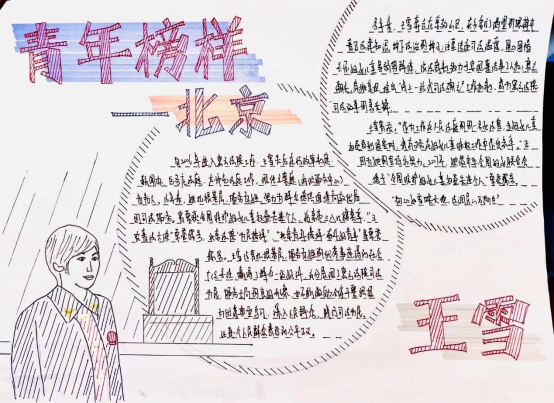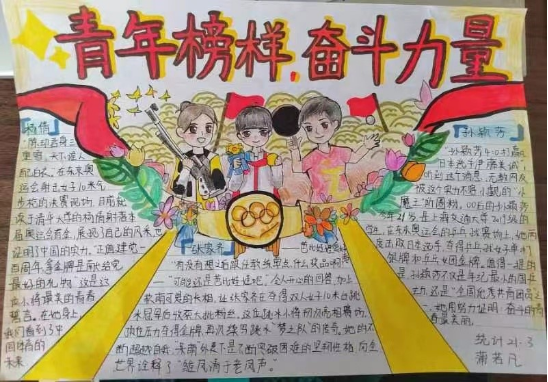 第一团小组的三名成员分别学习了自己家乡的青年榜样,并绘制了手抄报,互相交流学习。红色步调坚定,榜样力量无穷。在手抄报中小组成员介绍了三名运动员,他们年纪不大,却拥有超群的实力和能扛住压力的强大心脏,担当得起国家重托。他们用实际行动,向世界展示了新时代中国青年的担当与力量,是我们的青年榜样;