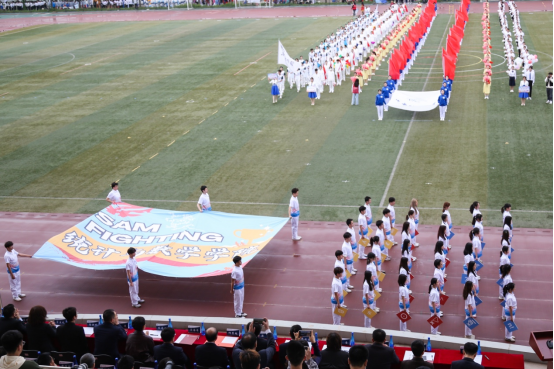 后来,我们手中有了定做的数学符号标志板、旗帜,在指导下对队形变换进行了进一步的优化。随着日复一日的训练,跑道上一个一个变队形的点位也变得日渐清晰,同学们配合的越来越有默契,变成了一个十分团结的大集体。