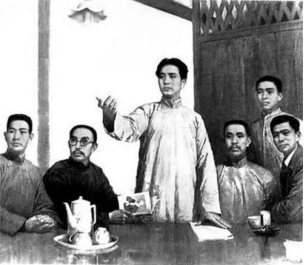 油画《在党的第一次代表大会上》,左起依次是王尽美、何叔衡、毛泽东、董必武、邓恩铭、陈潭秋