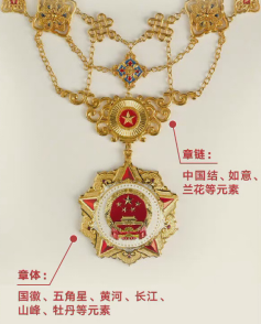 “共和国勋章”以红色、金色为主色调,章体采用国徽、五角星、黄河、长江、山峰、牡丹等元素,章链采用中国结、如意、兰花等元素,整体使用冷压成型、花丝镶嵌、珐琅等工艺制作,象征勋章获得者为共和国建设和发展作出的巨大贡献,礼赞国家最高荣誉,祝福祖国繁荣昌盛,寓意全国各族人民团结一心共筑中华民族伟大复兴的中国梦。