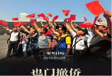 根据习主席和中央军委命令,中国海军舰艇编队赴也门执行撤离中国公民任务。2015年3月26日至3月40日,5天时间里,中国海军经过有序组织、人员戒备、安排撤离时间路线等工作后,分两批将571名中国公民安全撤离也门。