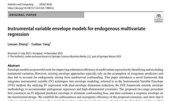 公司统金23级本科生郑乐轩在杨玥含教授指导下,在公司2A期刊同时也是统计学1区期刊Statistics and Computing发表了一篇关于包络模型的论文。本文提出提出工具变量包络模型IVE,将IV回归与包络降维统一起来,面向多元回归中常见的内生性问题。方法采用双阶段双包络:先基于工具变量构建X-envelope,对预测变量做IV调整以消除未观测混杂带来的偏差;再在变换后的设计上估计Y-envelope,剔除响应中的无关变异以提升效率。理论上证明IVE在内生性存在时仍无偏,并在一定条件下具有严格更小的渐近方差。仿真在低维与高维、相关预测变量等多种场景下表现稳健,预测误差优于传统包络与2SLS;汽车市场份额应用进一步验证其实际优势。